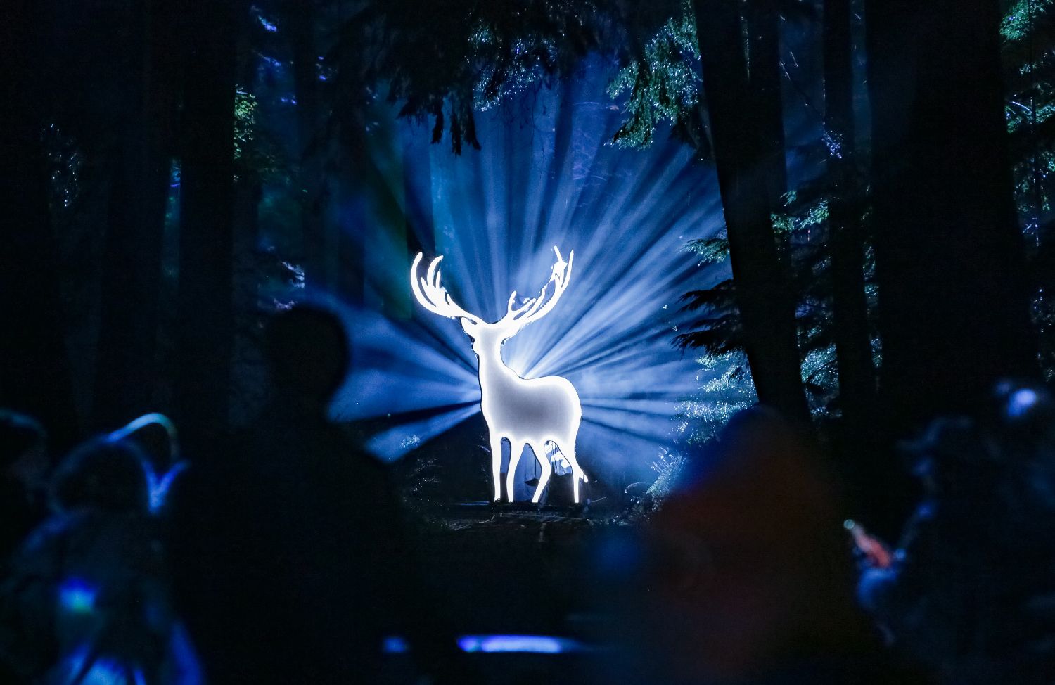 11月6日,在加拿大温哥华举行的“哈利波特禁忌森林体验”媒体预展活动中,游客观看灯光表演。“哈利波特禁忌森林体验”是一项沉浸式户外体验活动,以《哈利波特》系列电影中的“禁忌森林”为灵感,通过技术手段把户外森林变成魔法小径,为游客带来奇幻体验。(图片来源:本文图片均自新华社)