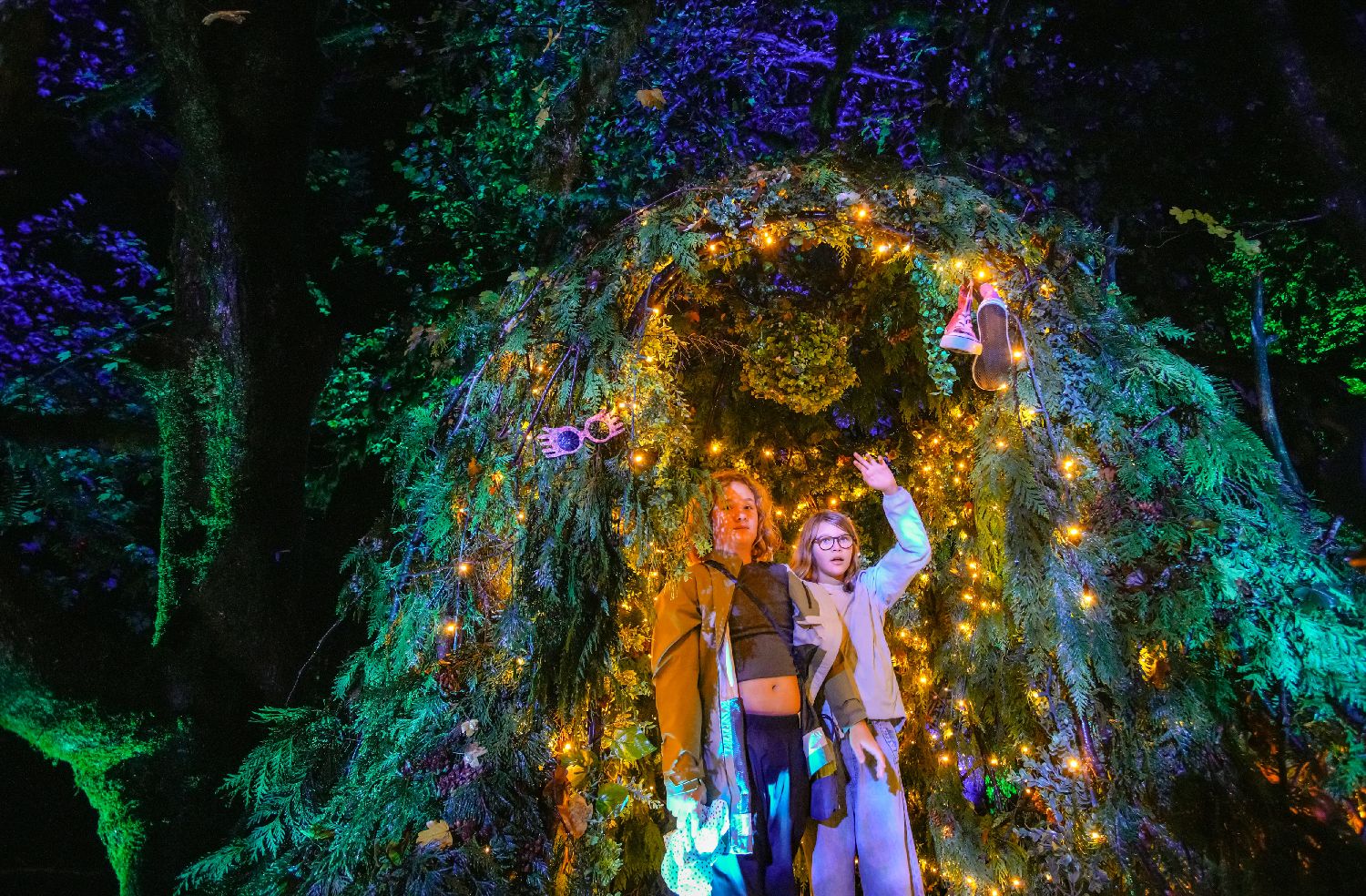 11月6日,在加拿大温哥华举行的“哈利波特禁忌森林体验”媒体预展活动中,游客漫步于灯光装饰的林间小径。