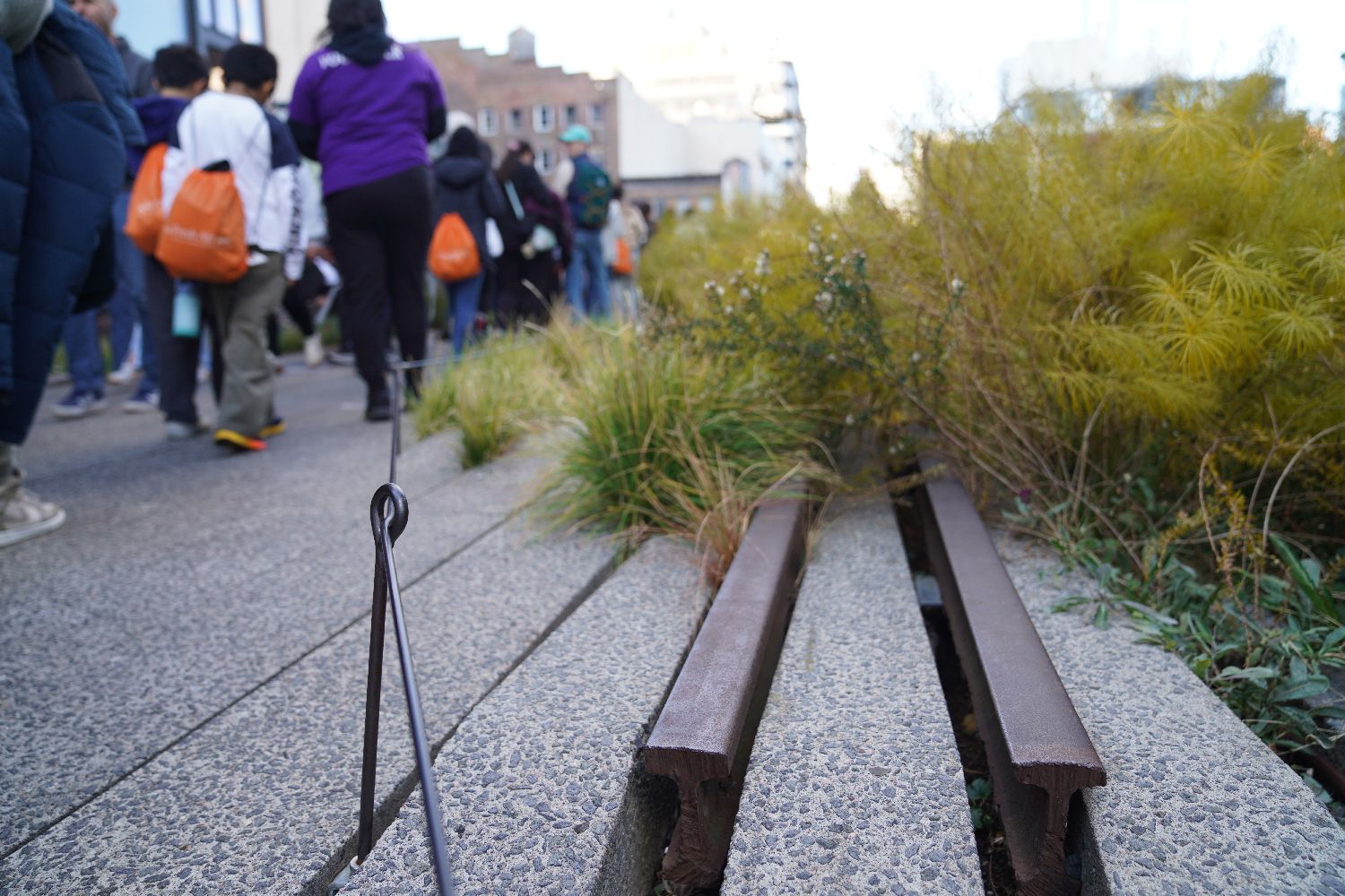 11月8日,在美国纽约,游人从保护下来的旧铁轨旁经过。