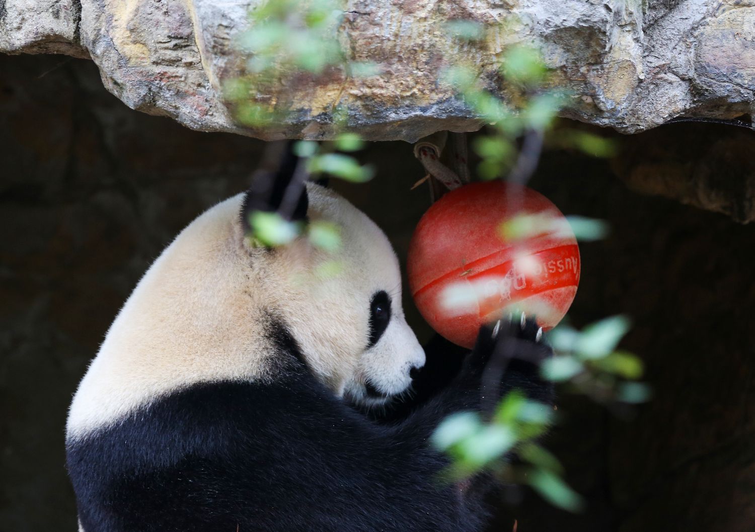 11月10日,大熊猫“怡兰”在澳大利亚阿德莱德动物园玩耍。