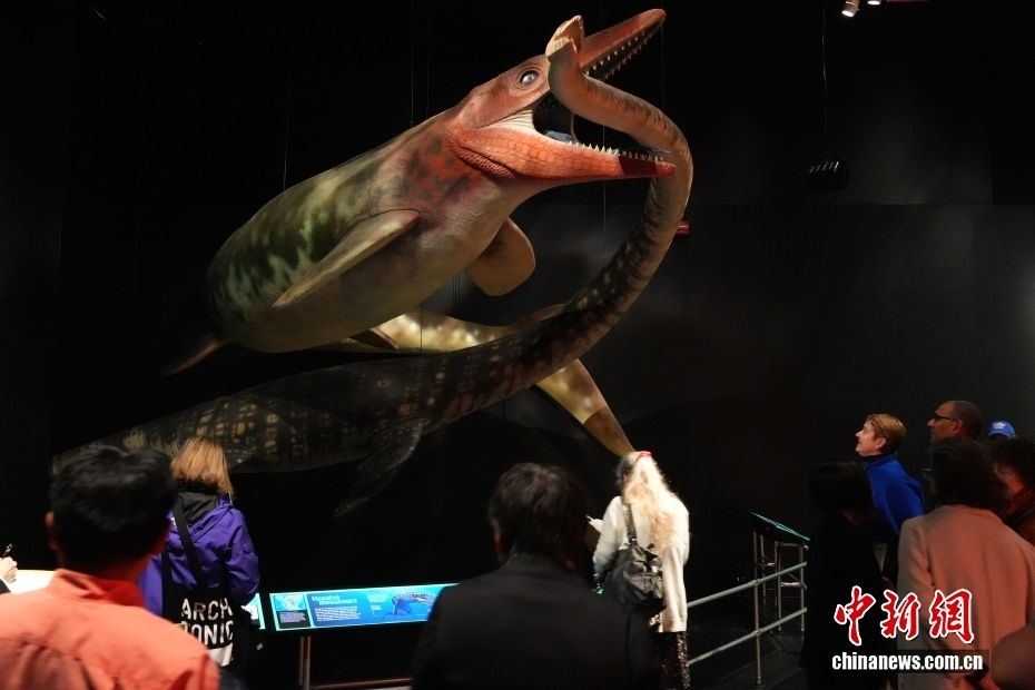 图为展览以等比例模型展示生活在海洋中的沧龙掠食蛇颈龙。