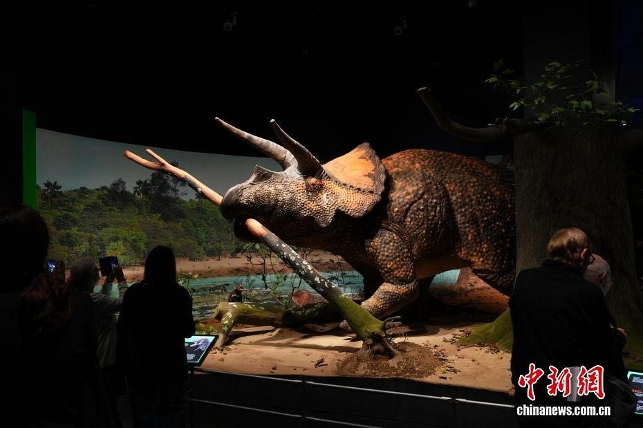 图为展览展示生活在北美洲西部的三角龙模型。
