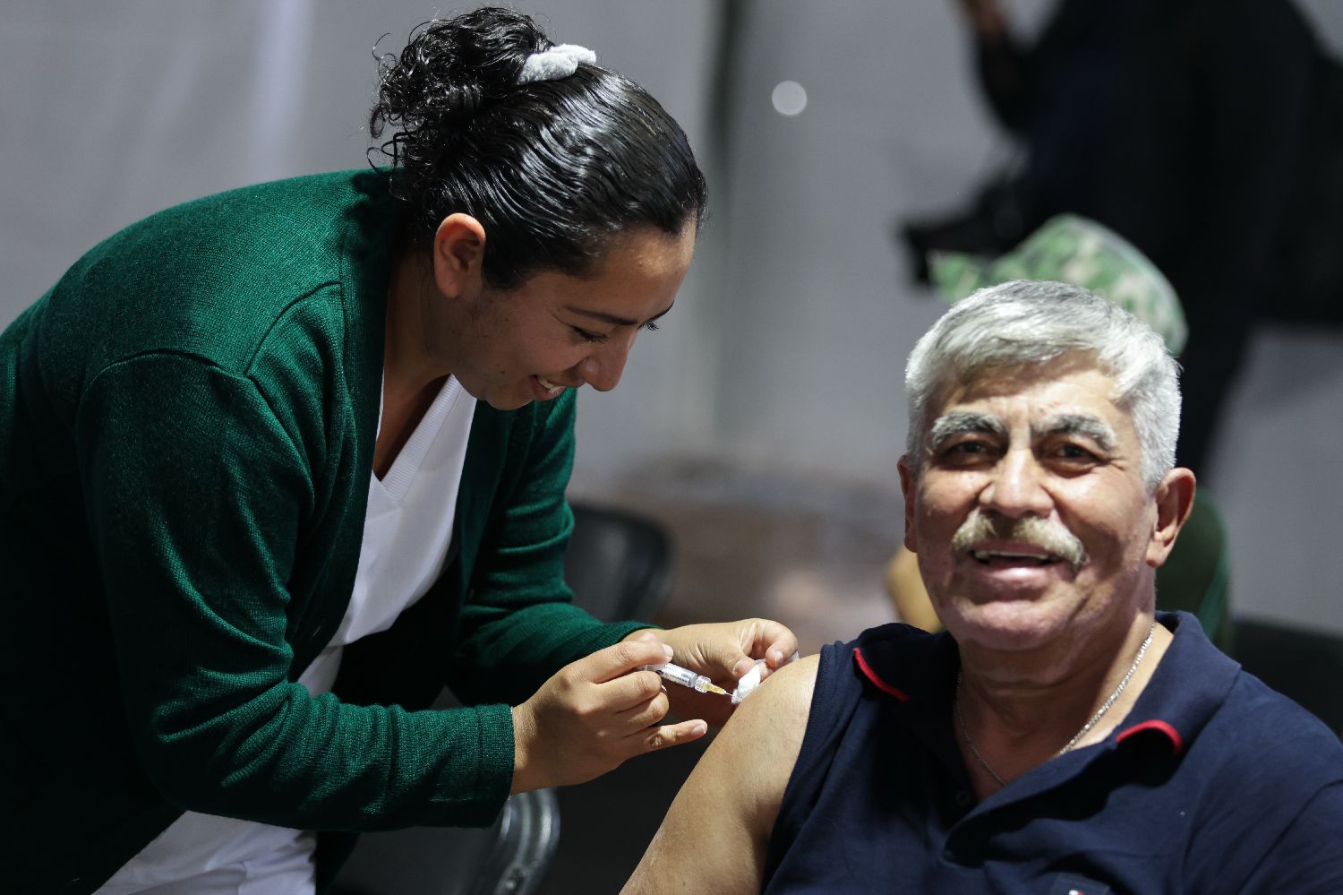 11月12日,在墨西哥首都墨西哥城一处疫苗接种中心,医务人员为民众接种疫苗。