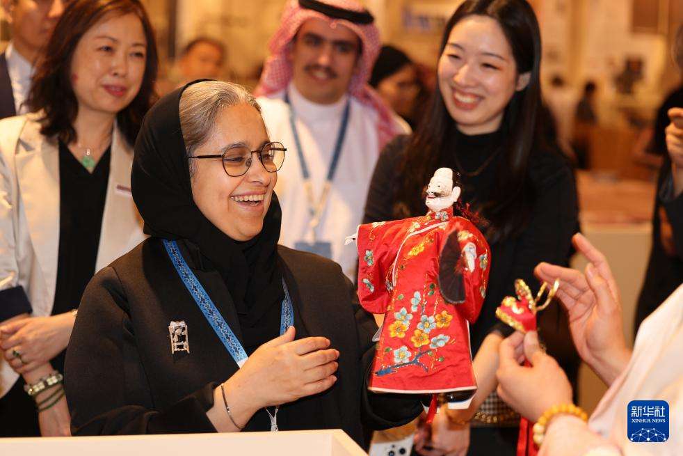 11月13日,在沙特首都利雅得,嘉宾在第三届沙特阿拉伯国际手工艺周中国馆欣赏木偶。