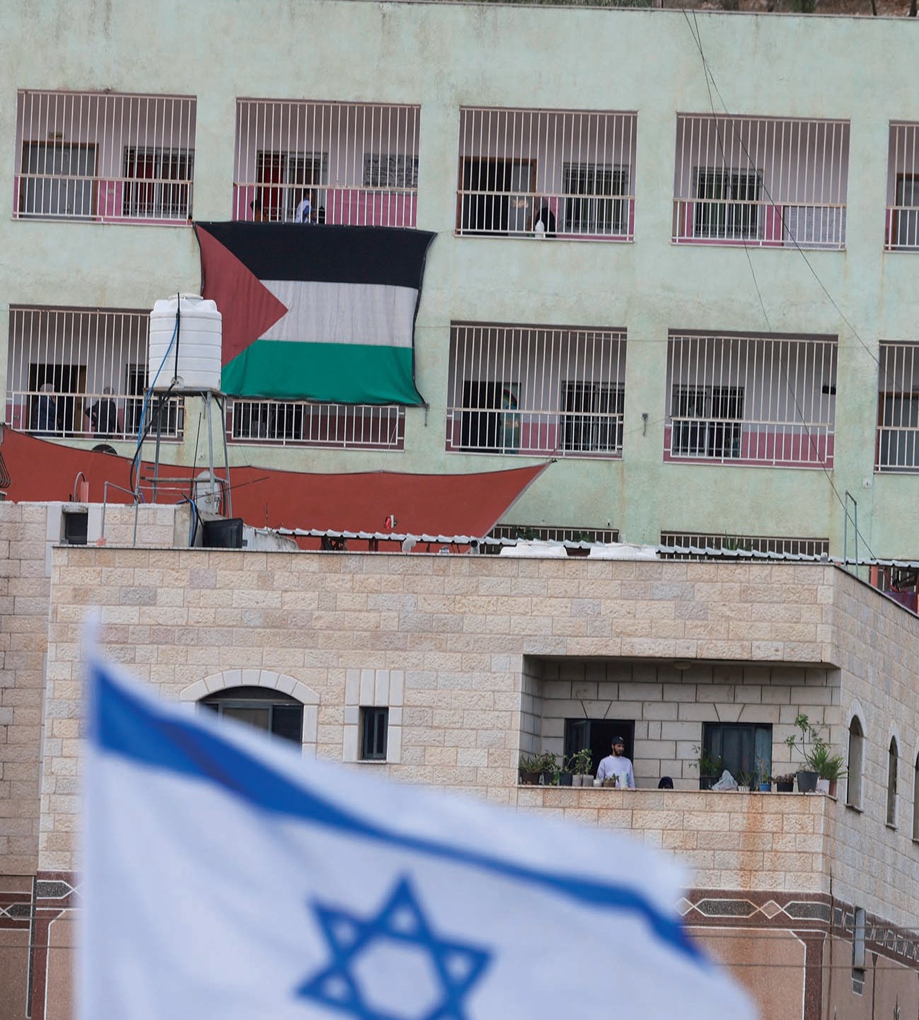 图为11月16日被占领的约旦河西岸纳布卢斯以南的阿斯萨维亚村一栋建筑上悬挂着巴勒斯坦旗帜,而村口却飘扬着以色列国旗。法新社图
