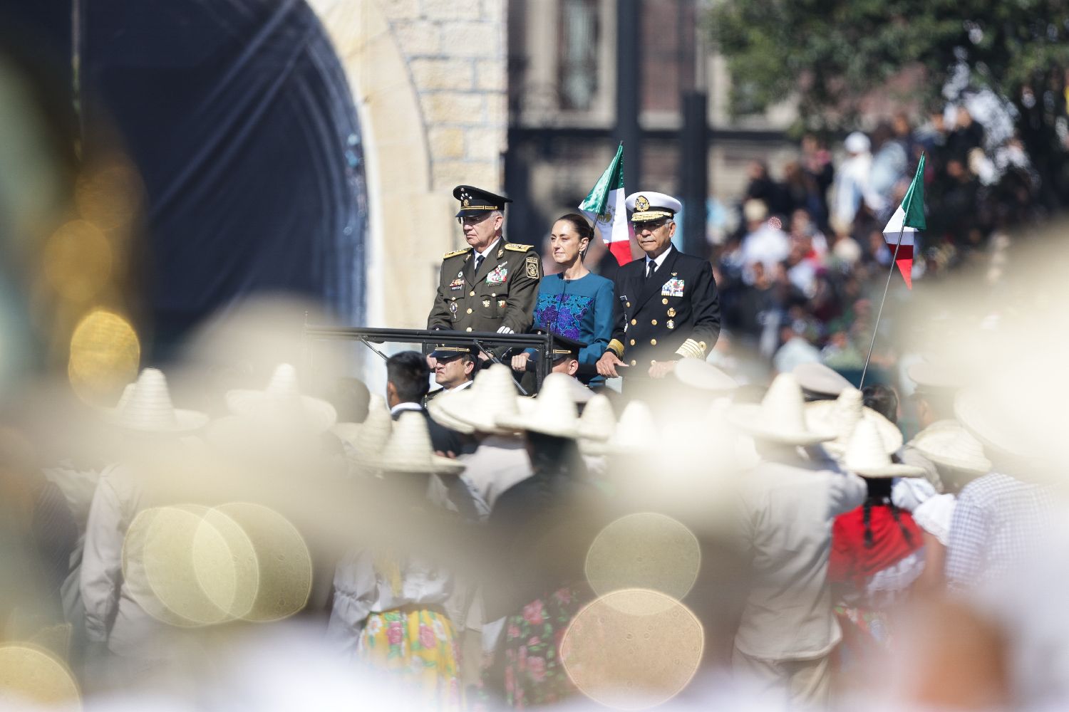 11月20日,在墨西哥首都墨西哥城,墨西哥总统辛鲍姆(中)参加纪念活动。