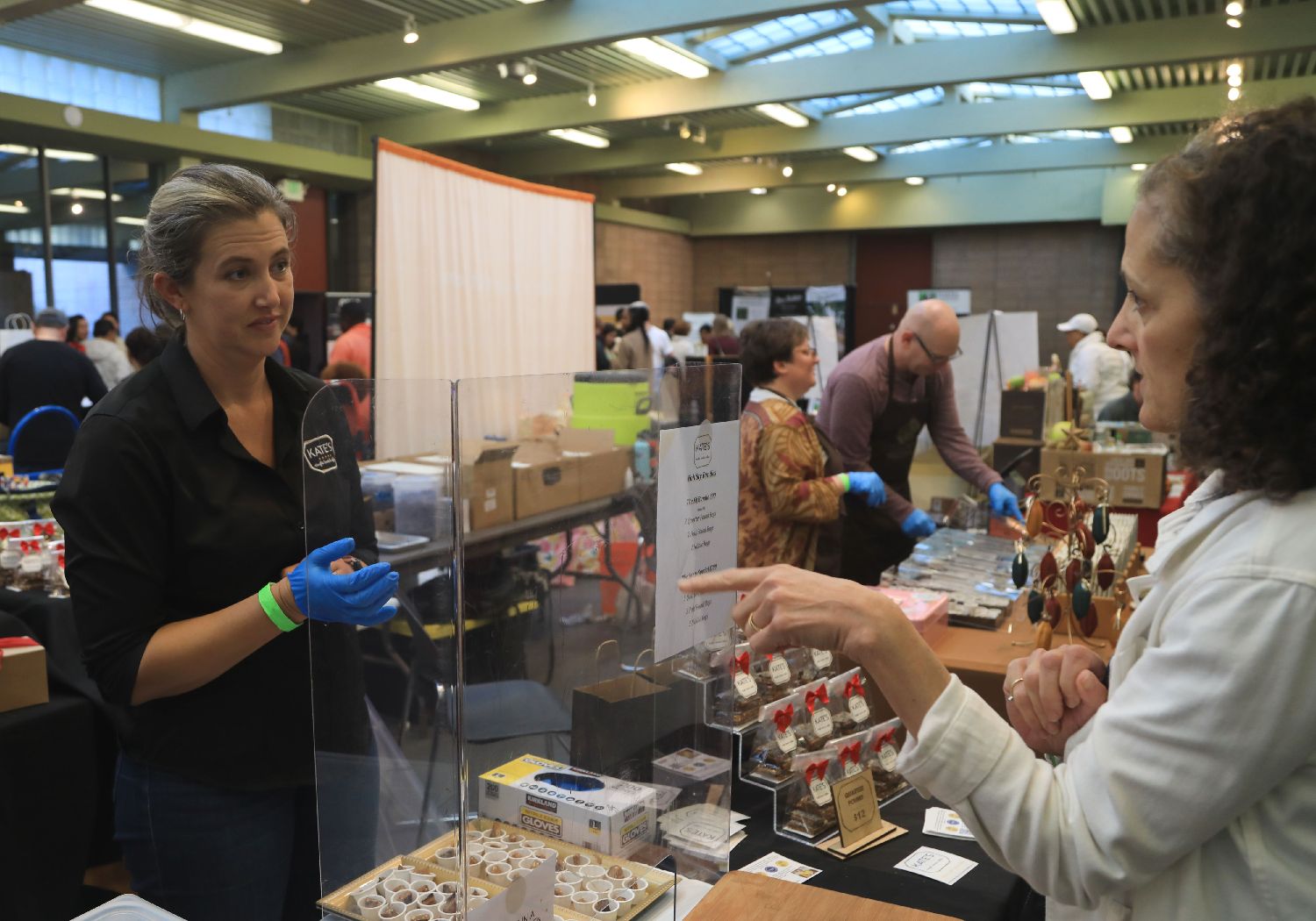 11月23日,在美国旧金山,工作人员(左)在巧克力沙龙上向参观者介绍产品。(图片来源:新华社)