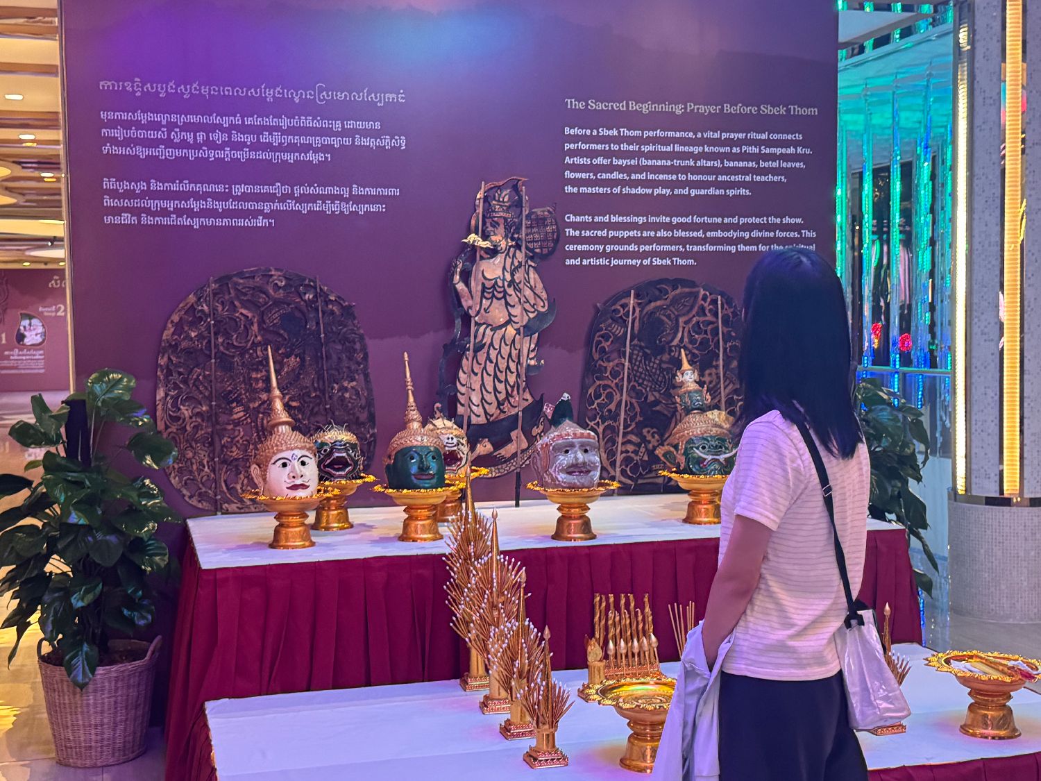 图为一名观众驻足欣赏柬埔寨大皮影戏开演前的祈福仪式道具。