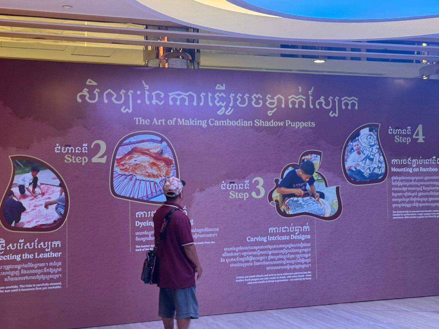 此次展览在一个繁华的商业场所举办,许多国际游客慕名前来观展。工作人员金灵说:“许多人平时只能在柬埔寨寺庙或各种重大活动中看到大皮影戏演出,这个展览给大家提供一个近距离接触高棉传统艺术的机会。”