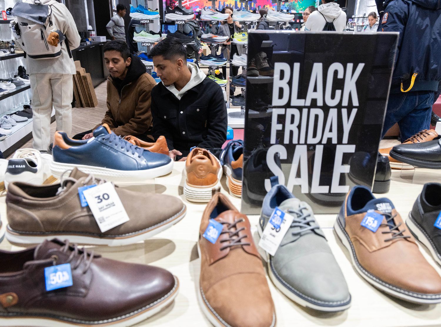11月28日,顾客在加拿大多伦多的一家商店买鞋。11月28日,人们在美国加州旧金山湾区城市圣何塞一家商场内购物。(图片来源:本文图片均据新华社)