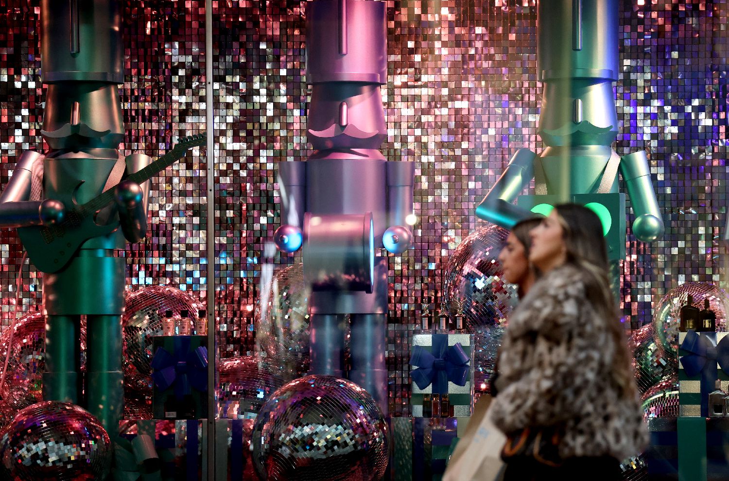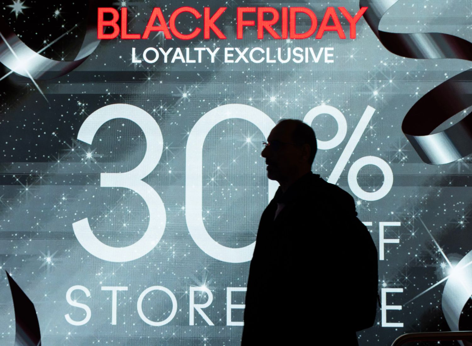 11月28日,在加拿大多伦多,一名男子从一家商店的促销广告旁经过。