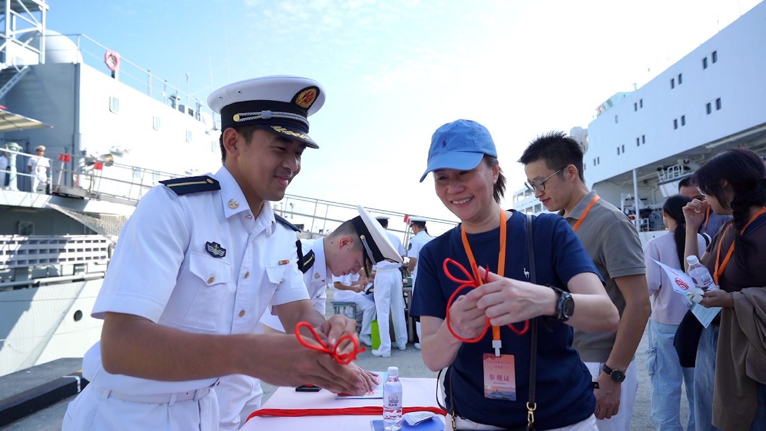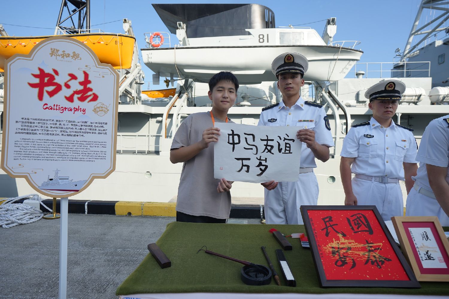 12月1日,在马来西亚巴生港,参观者在中国海军989编队组织的舰艇开放活动上展示书法。
