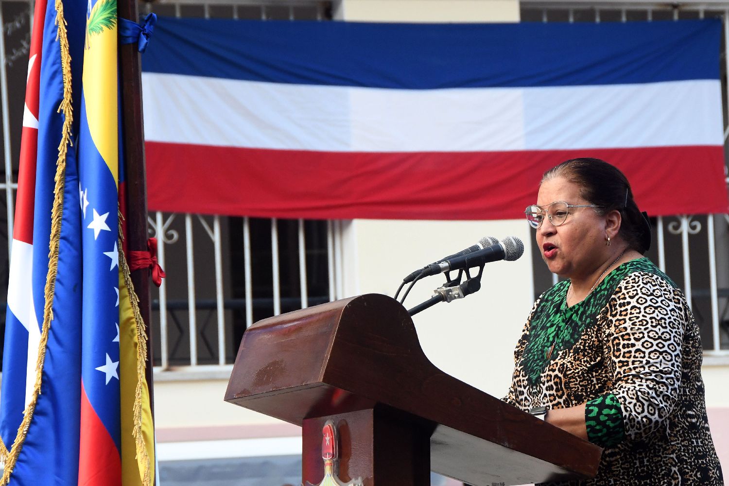 12月6日,在古巴首都哈瓦那,古巴妇女联合会总书记特蕾莎·阿马雷列在声援委内瑞拉的集会上发表讲话。
