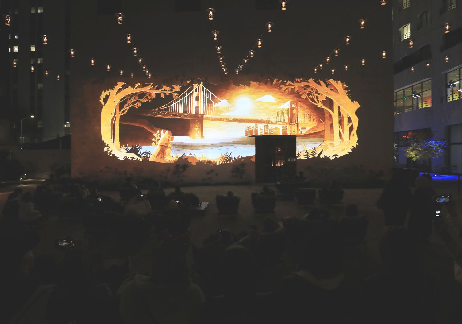 12月5日晚,美国旧金山Let's Glow SF建筑外墙艺术投影活动举行亮灯仪式。从12月5日至14日的夜间,旧金山市中心八座标志性建筑的外墙上将展示大型艺术投影作品。
