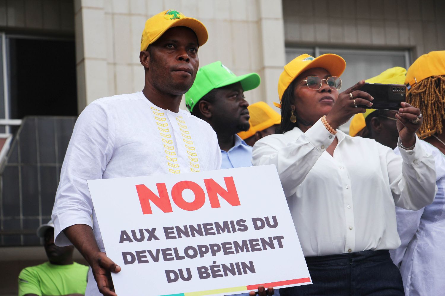12月8日,在贝宁经济首都科托努的保加利亚广场,民众手持标语参加集会声援总统塔隆。