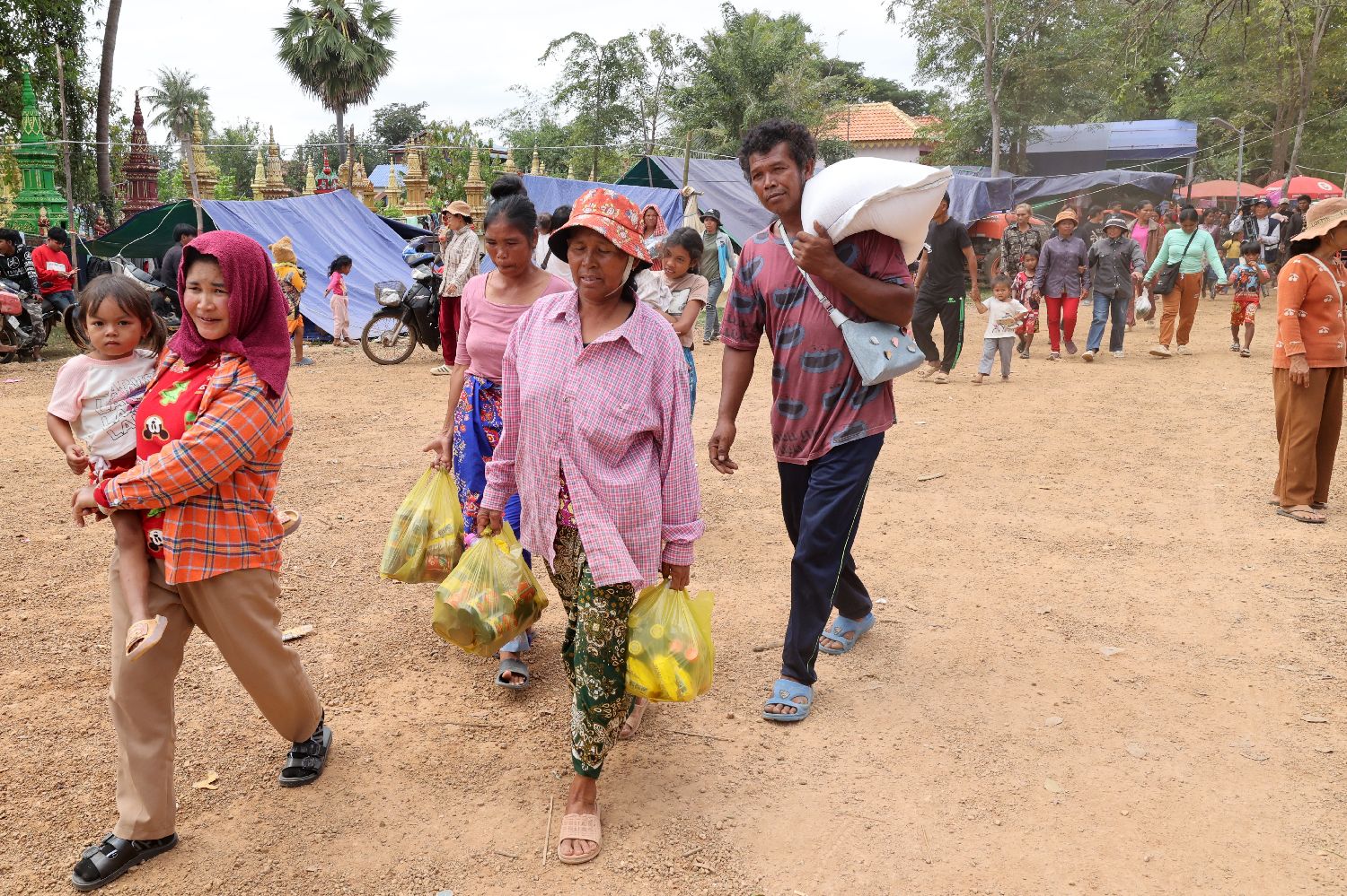 12月11日,在柬埔寨暹粒省一处居民安置点,人们领取救济物资后返回。