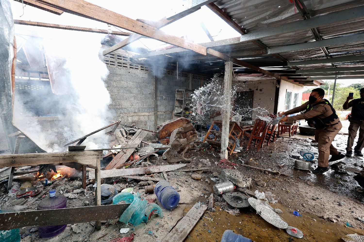 12月11日,在泰国素林府,警察向被炮火损毁的房屋洒水灭火。(图片来源:新华社)