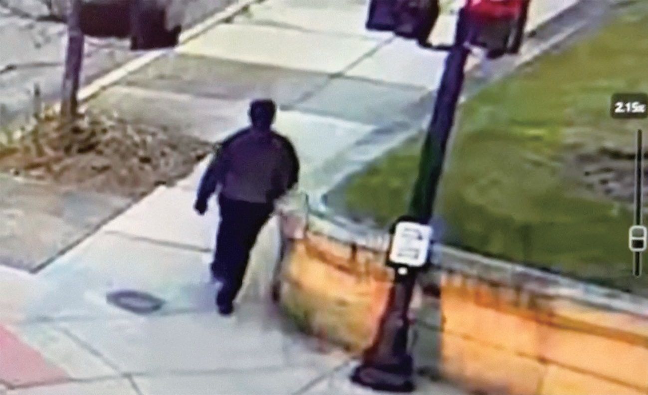 图为警方发布的监控视频画面显示嫌疑人沿校园附近道路行走。法新社图
