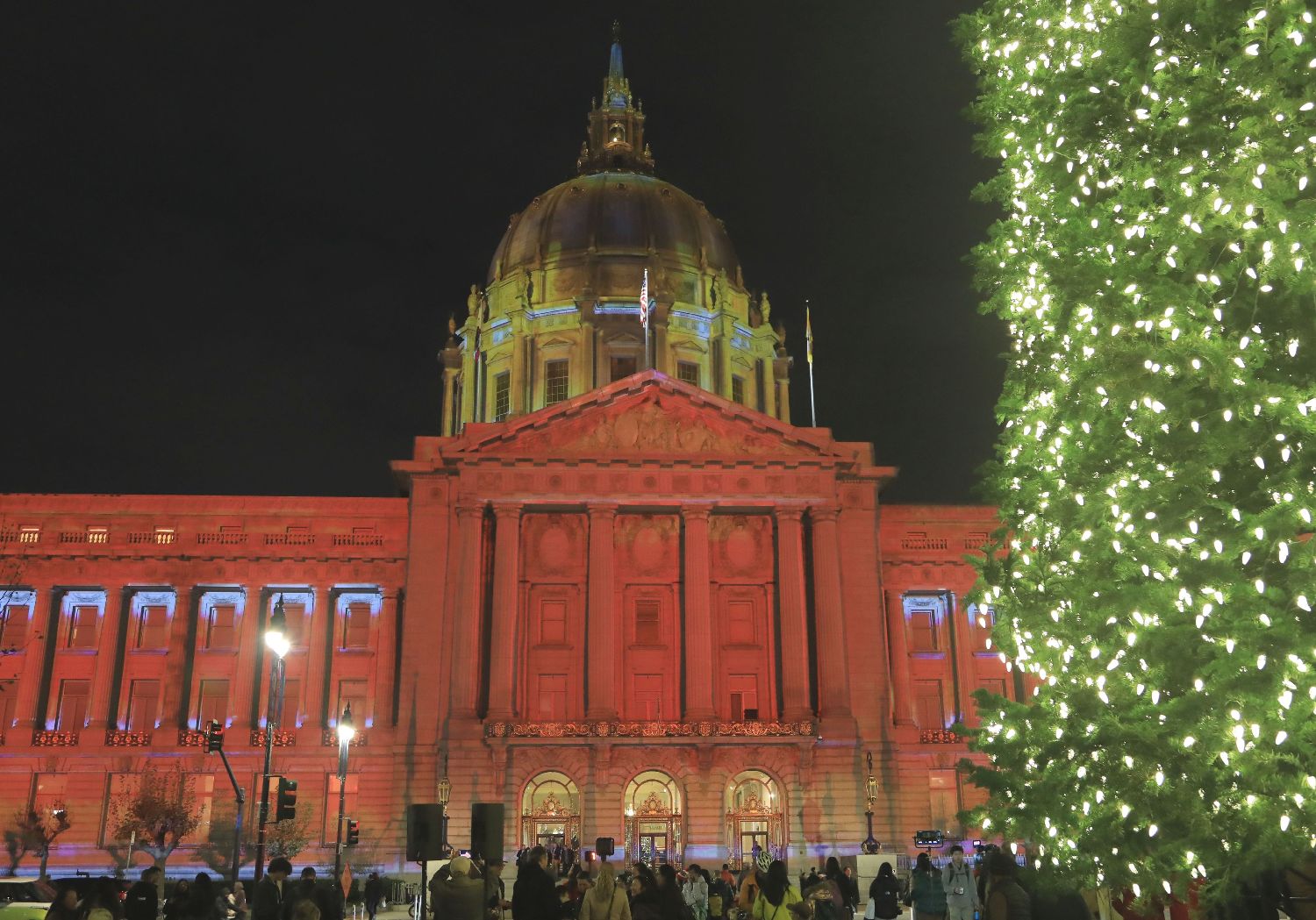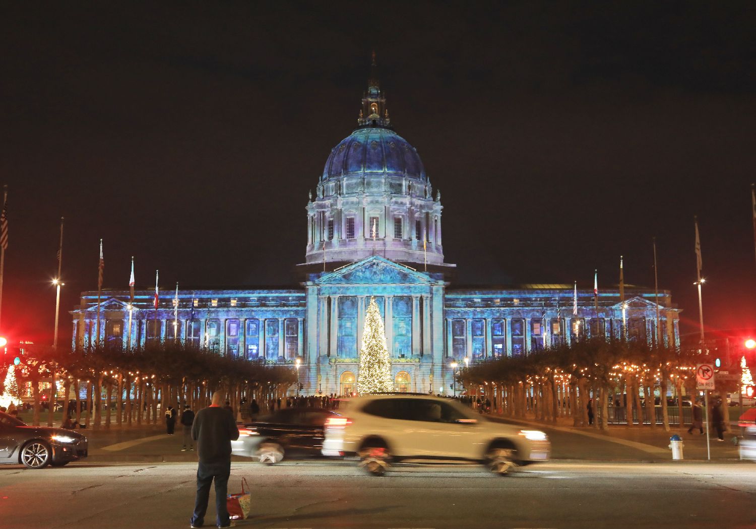 12月16日在美国旧金山市政厅外拍摄的灯光秀。
