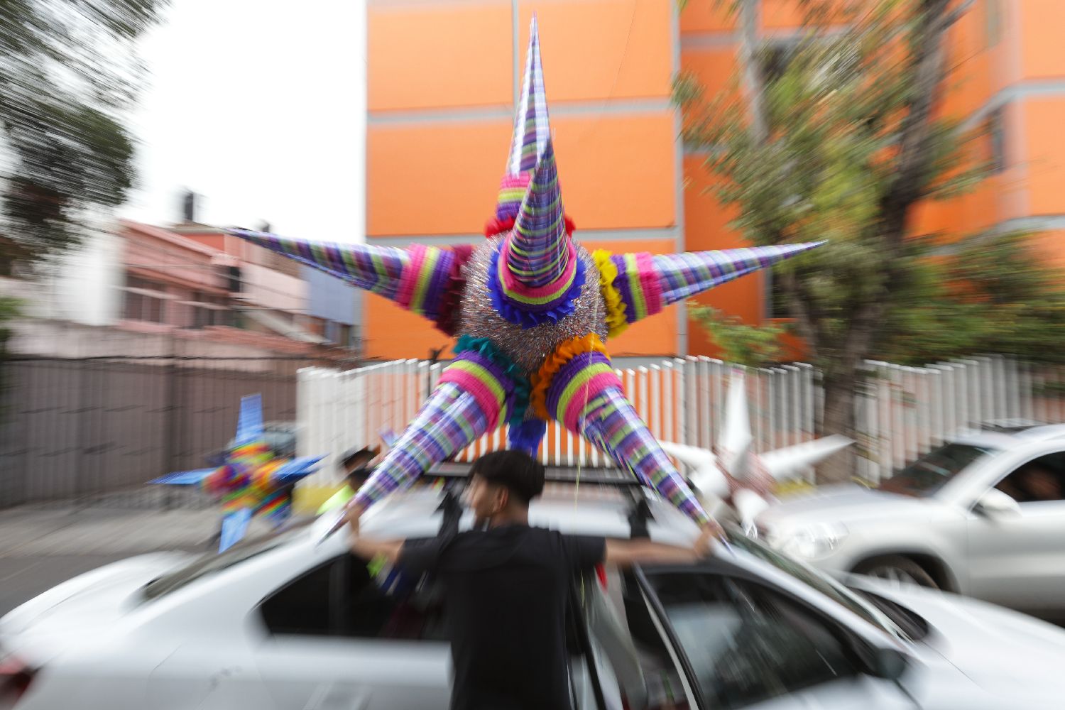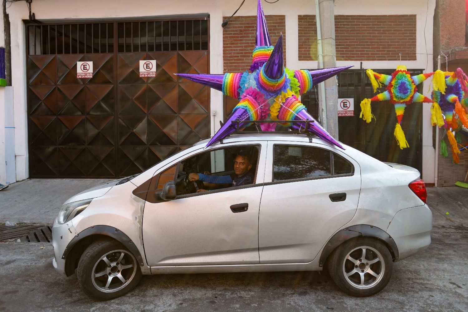 12月16日,在墨西哥首都墨西哥城,一名男子将“皮纳塔”放置在车上。