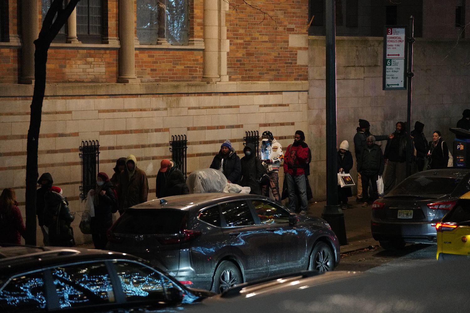 12月17日,数百名无家可归者和其他需要救助的人在美国纽约曼哈顿的一个救助点排起长队等待领取一份免费晚餐。