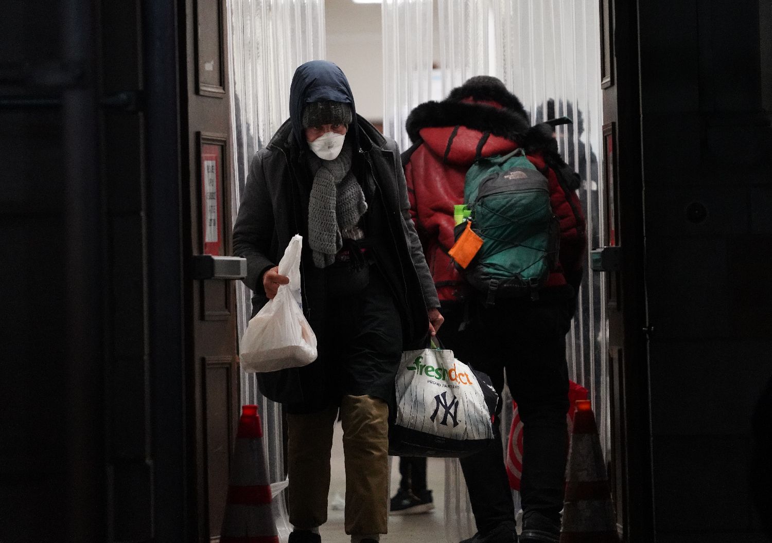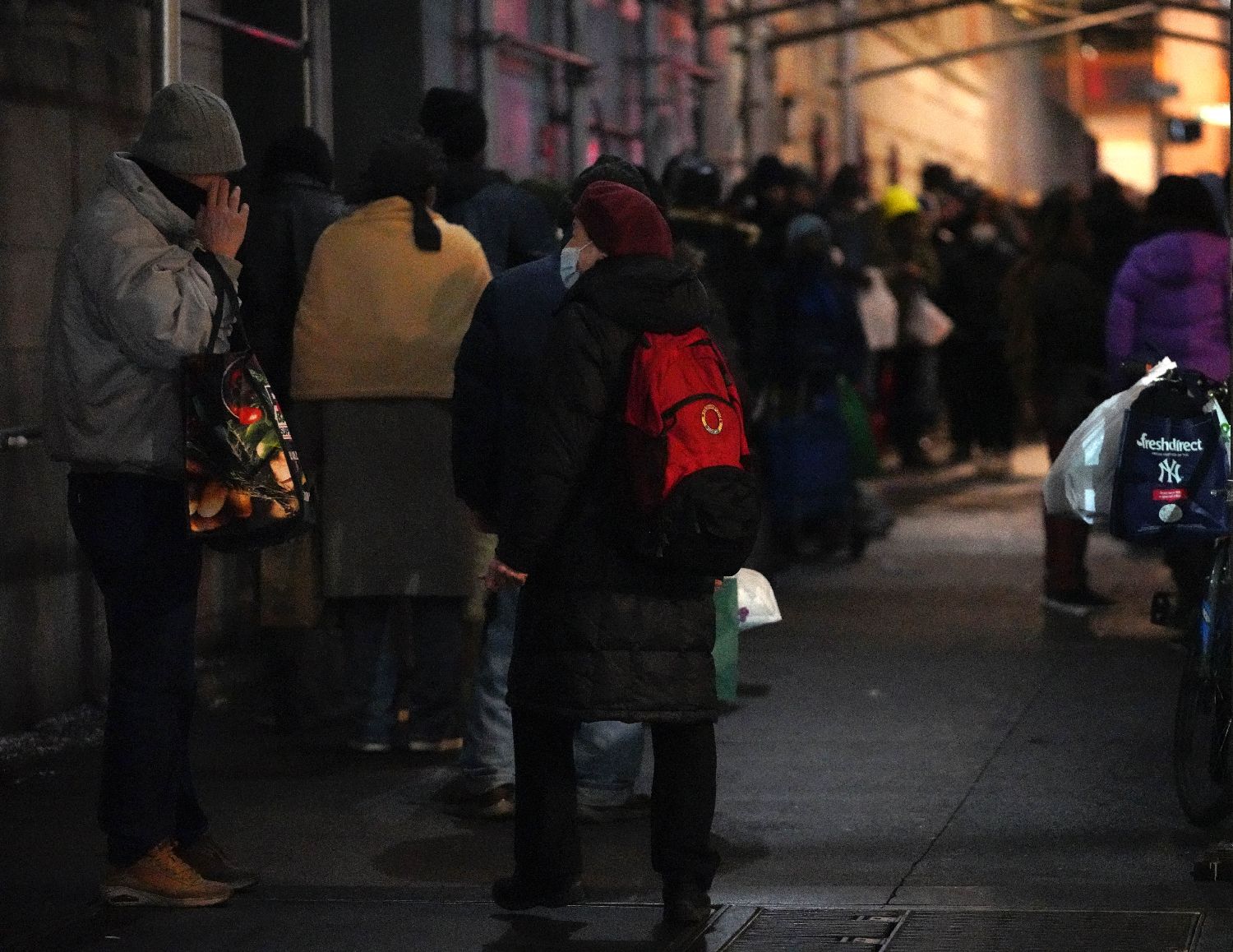 12月17日,在美国纽约曼哈顿的一处救助点,民众排队等待领取免费晚餐。