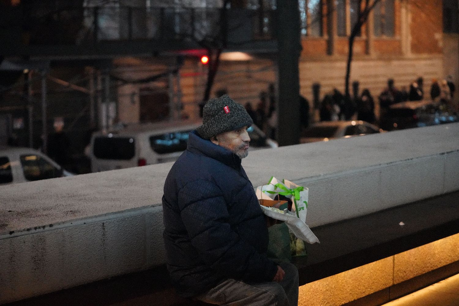 12月17日,在美国纽约曼哈顿的一处救助点外,一名男子吃领取到的免费晚餐。