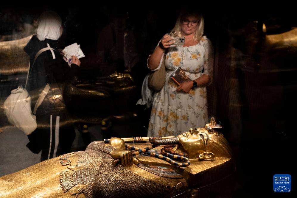 12月20日,游客在埃及吉萨的大埃及博物馆观赏法老图坦卡蒙的黄金内棺。(图片来源:本文图片均据新华社)