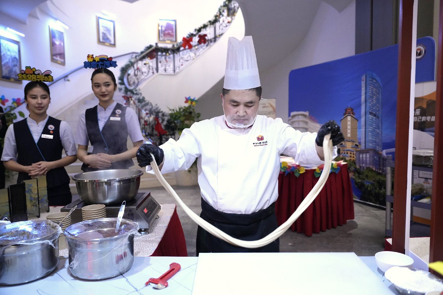 12月24日,在哈萨克斯坦首都阿斯塔纳,厨师在中国美食节上制作拉面。(图片来源:本文图片均据新华社)