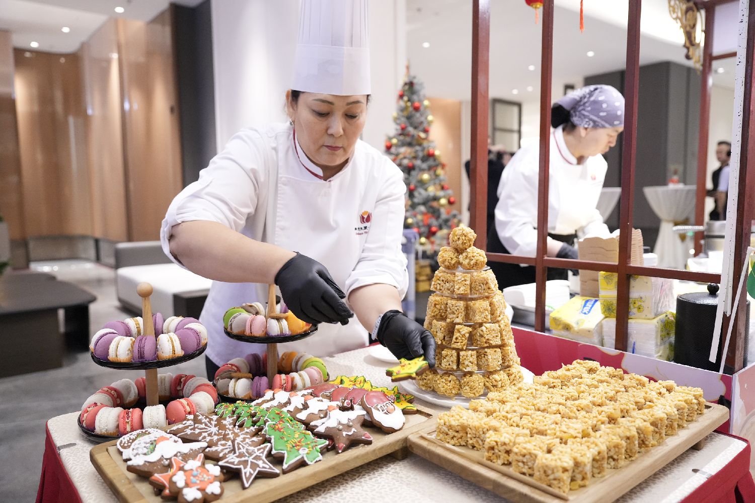 12月24日,在哈萨克斯坦首都阿斯塔纳,厨师在中国美食节上码放甜点。