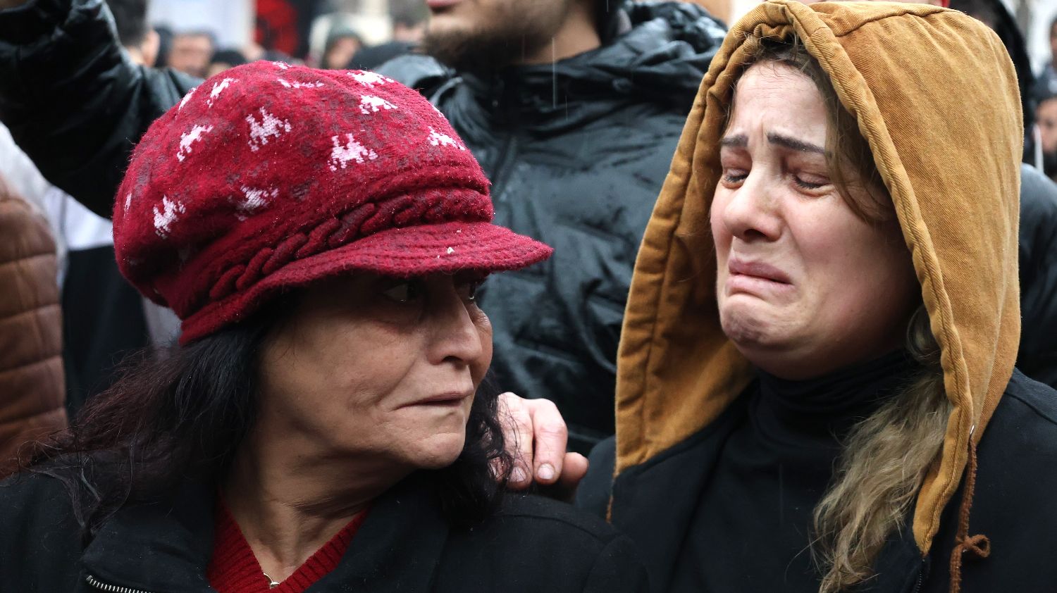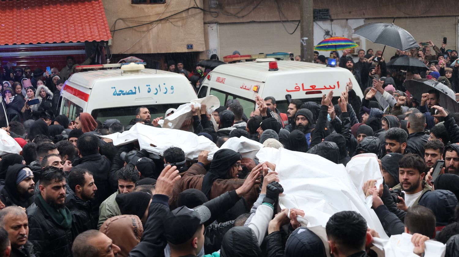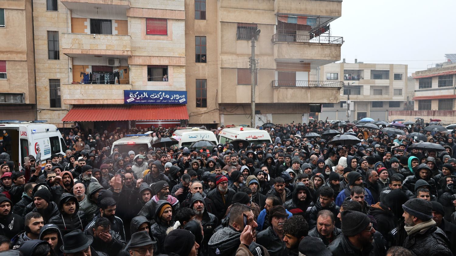12月27日,在叙利亚中部霍姆斯市,人们在雨中参加清真寺恐怖袭击遇难者的葬礼。