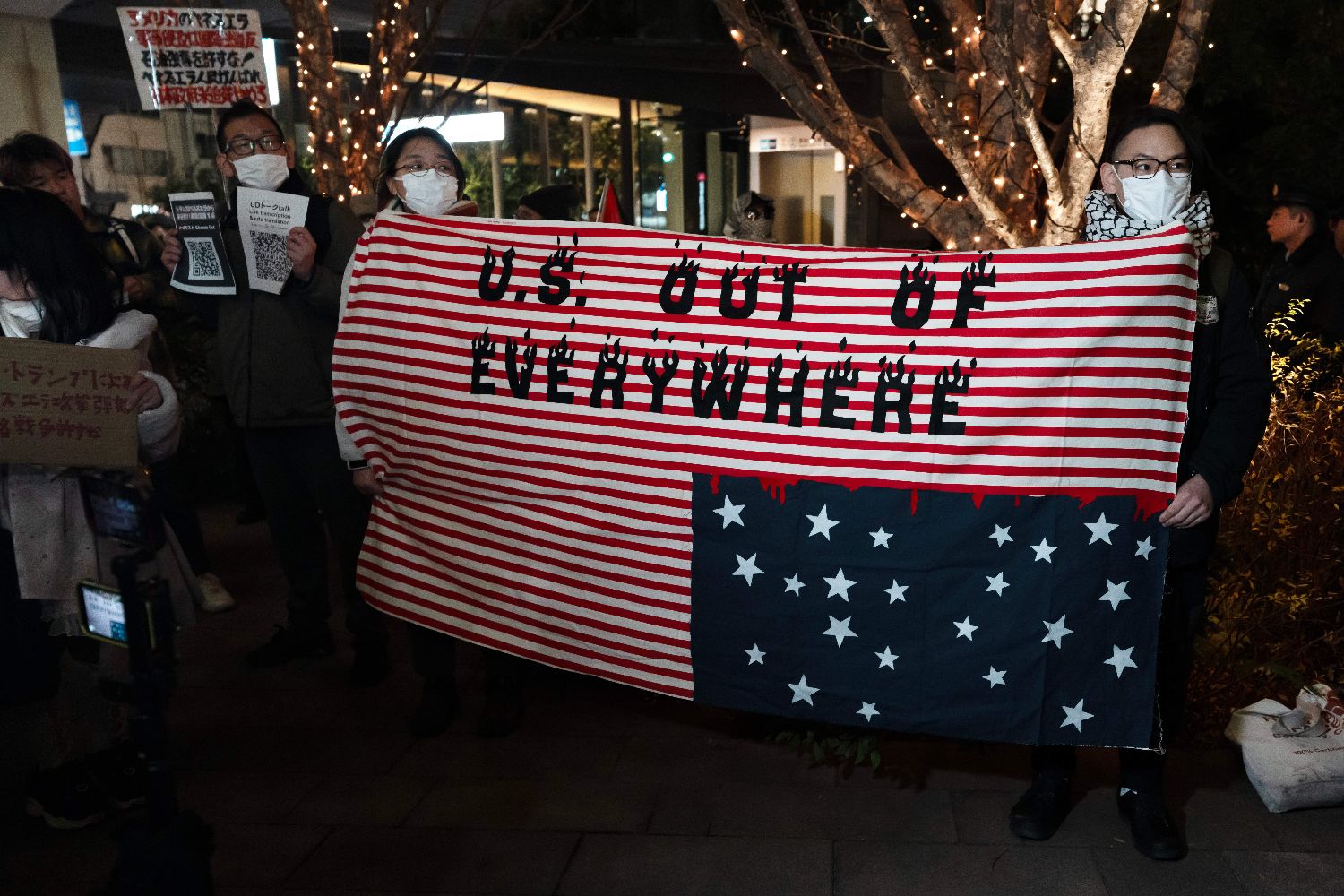 近日,在日本东京的美国驻日本大使馆外,民众抗议美国对委内瑞拉发动军事打击。
