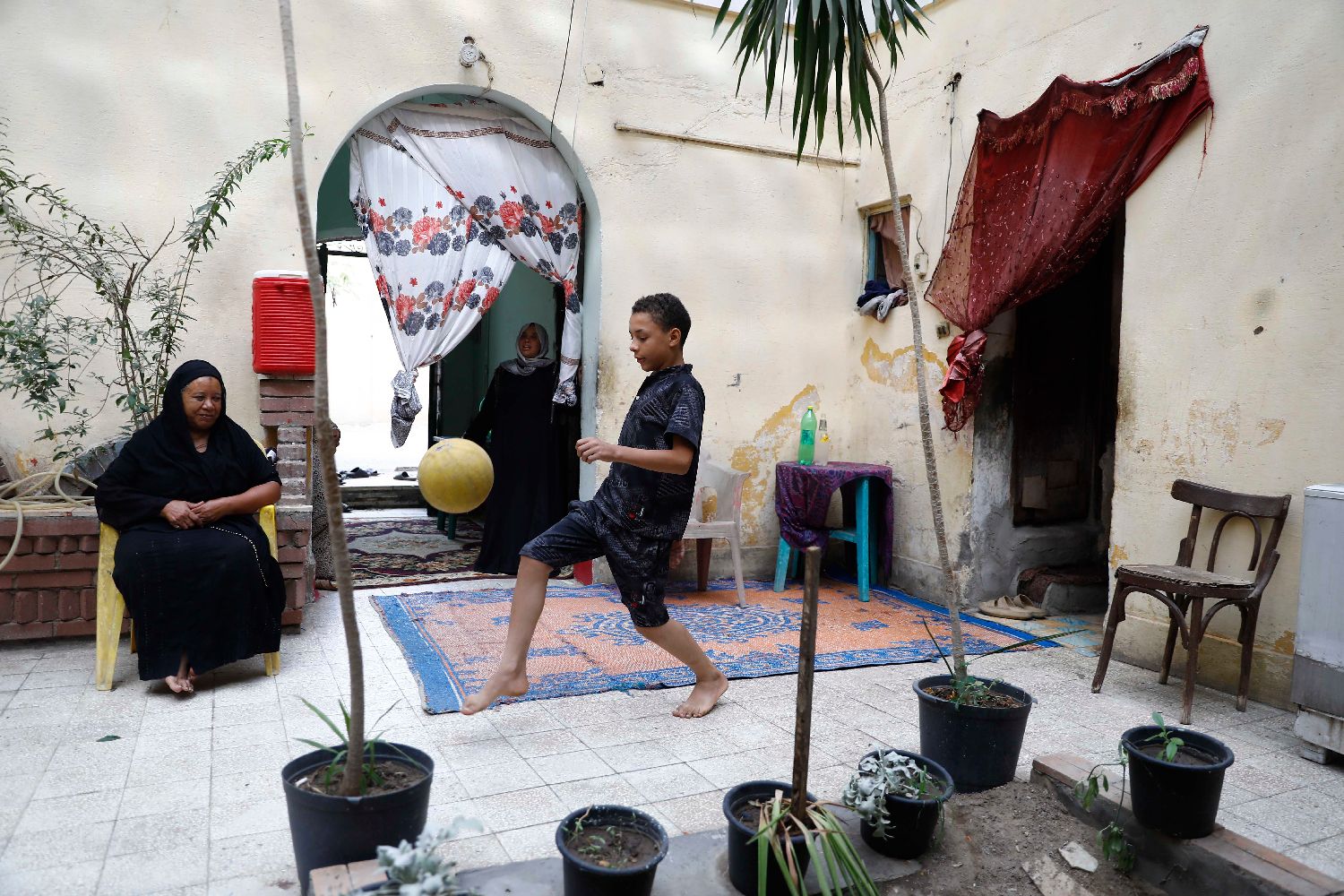 在埃及开罗贫民窟“死人城”的“卡拉法”公墓群,居民卡里姆(右)在墓宅中踢足球。