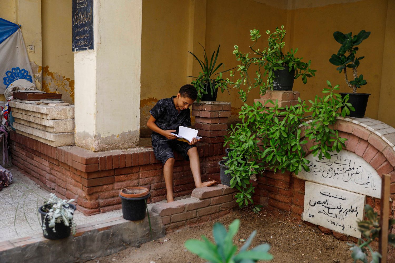 在埃及开罗贫民窟“死人城”的“卡拉法”公墓群,居民卡里姆在墓宅中看书。