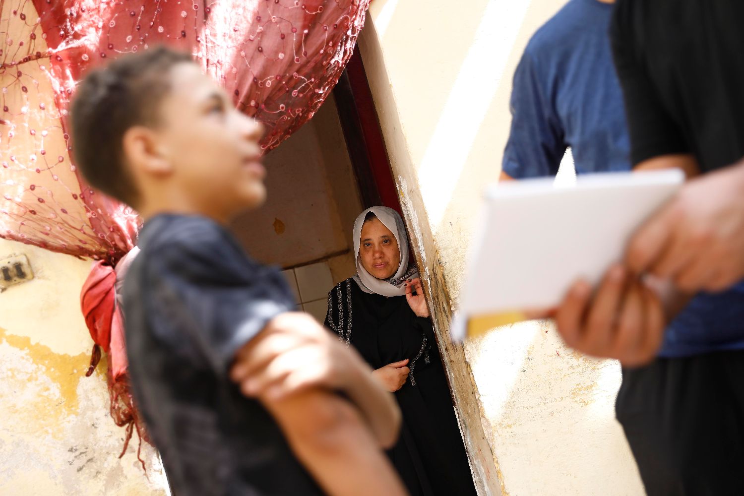 在埃及开罗贫民窟“死人城”的“卡拉法”公墓群,居民扎伊娜卜(中)倚靠在墓宅的墙壁上。