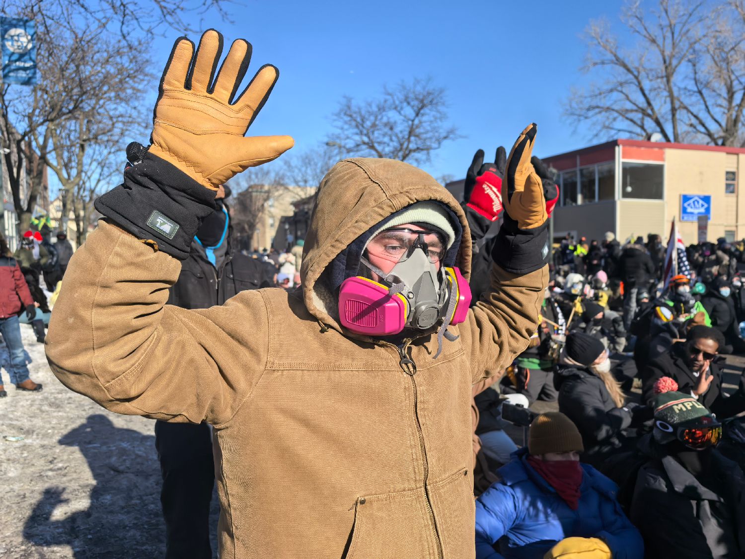 1月24日在美国明尼苏达州明尼阿波利斯市拍摄的示威抗议现场。