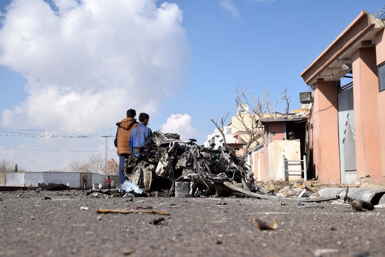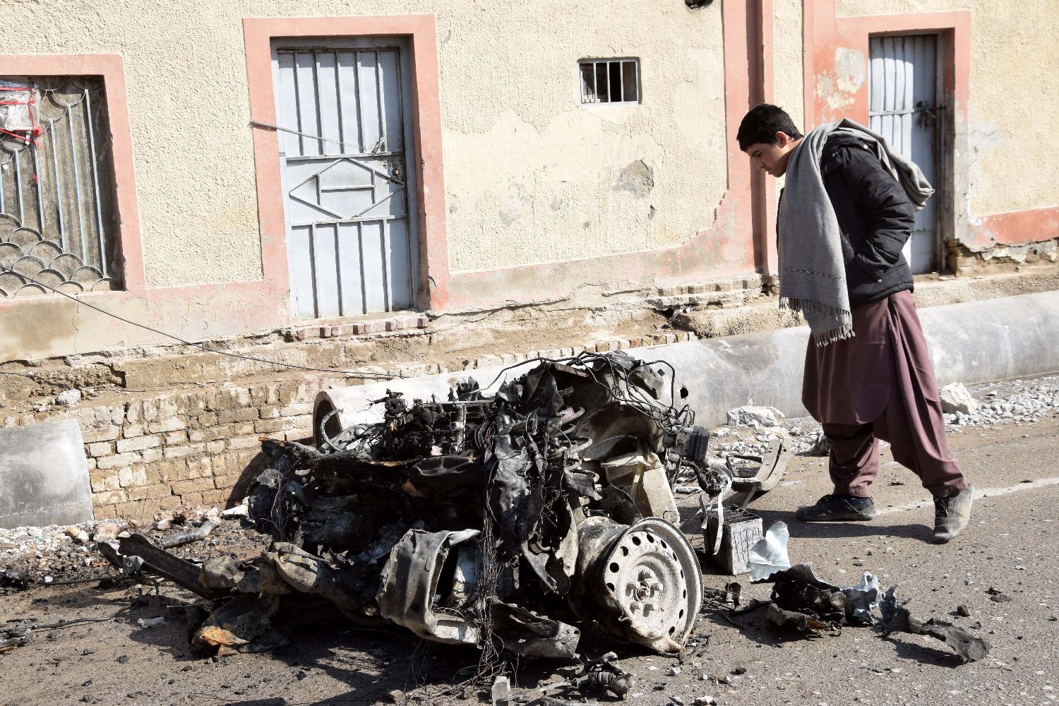 1月31日,在巴基斯坦西南部俾路支省奎达地区,当地居民经过被烧毁的车辆。
