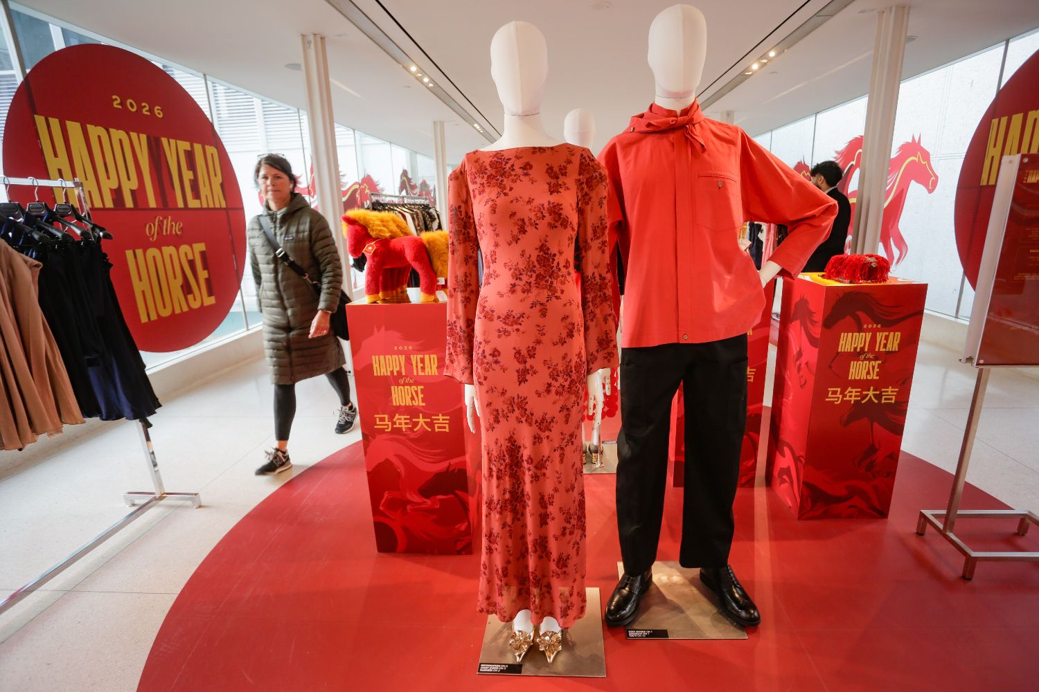 2月4日,顾客走过加拿大温哥华一家百货商店内展示的春节主题服饰。