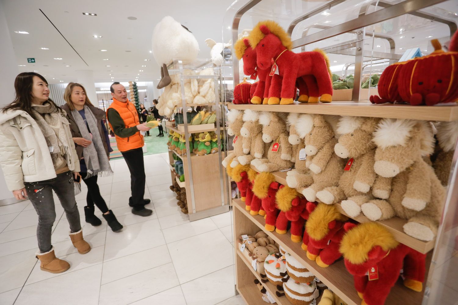 2月4日,在加拿大温哥华一家百货商店,顾客选购马年毛绒玩具。