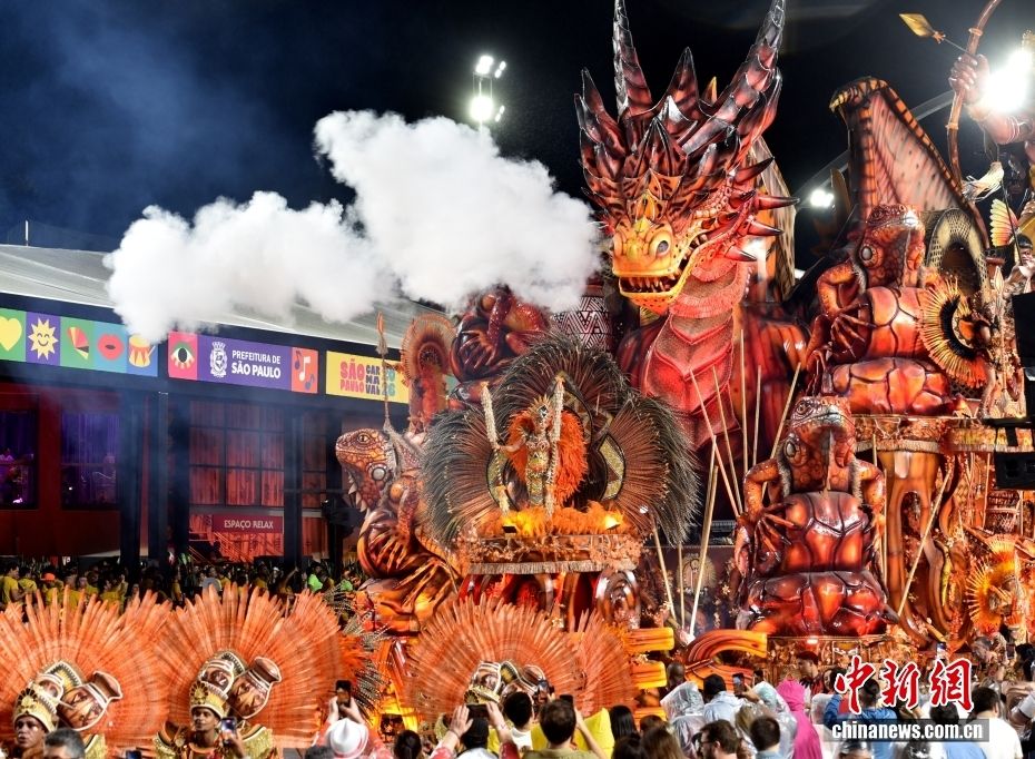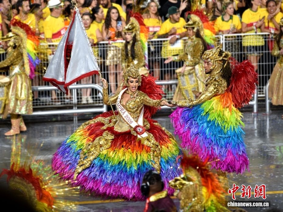 当地时间2月21日晚间至2月22日凌晨,巴西圣保罗2026年狂欢节冠军巡游表演在圣保罗举行,特级组的前五名和各组别的前两名共9间桑巴舞校重返安年比桑巴大道进行收官表演。