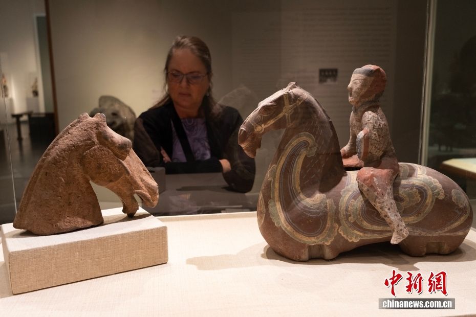 当地时间2月26日,美国纽约大都会博物馆,观众参观“汉 彩绘陶骑兵俑”、“汉 陶马头”。