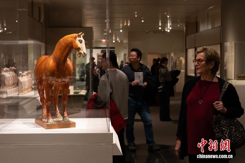 当地时间2月26日,美国纽约大都会博物馆,观众参观“唐 褐釉陶马”。