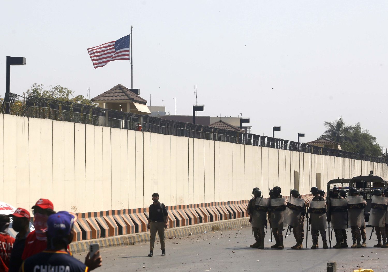 3月1日,执法人员(画面右侧)在巴基斯坦南部城市卡拉奇的美国驻卡拉奇领事馆外控制局势。
