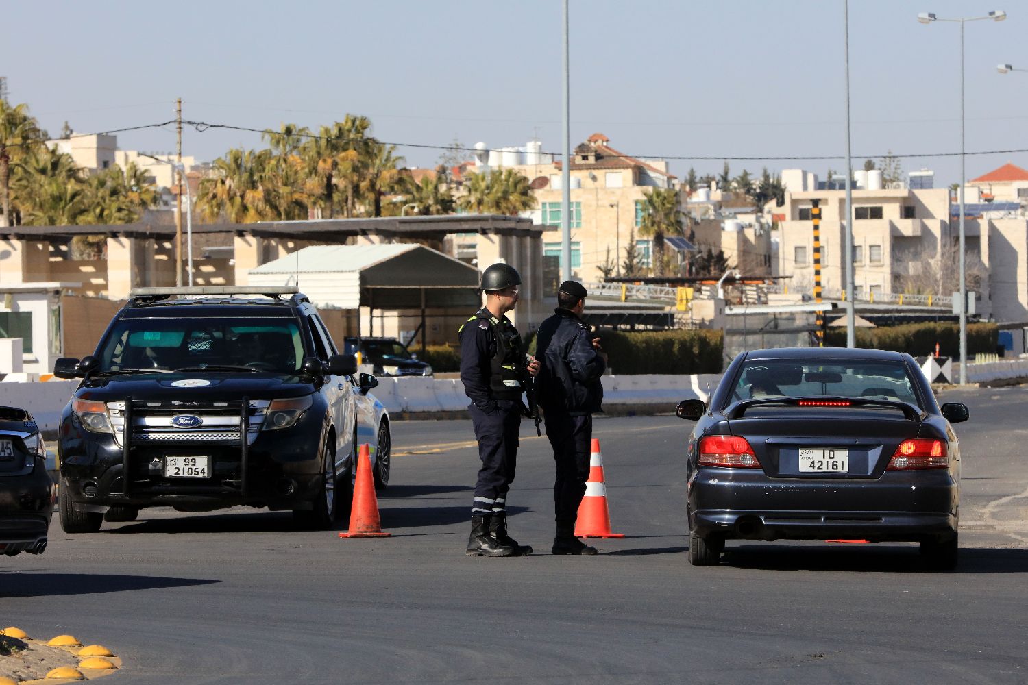 3月3日,在约旦首都安曼,警察封锁美国驻约旦大使馆所在区域的道路。