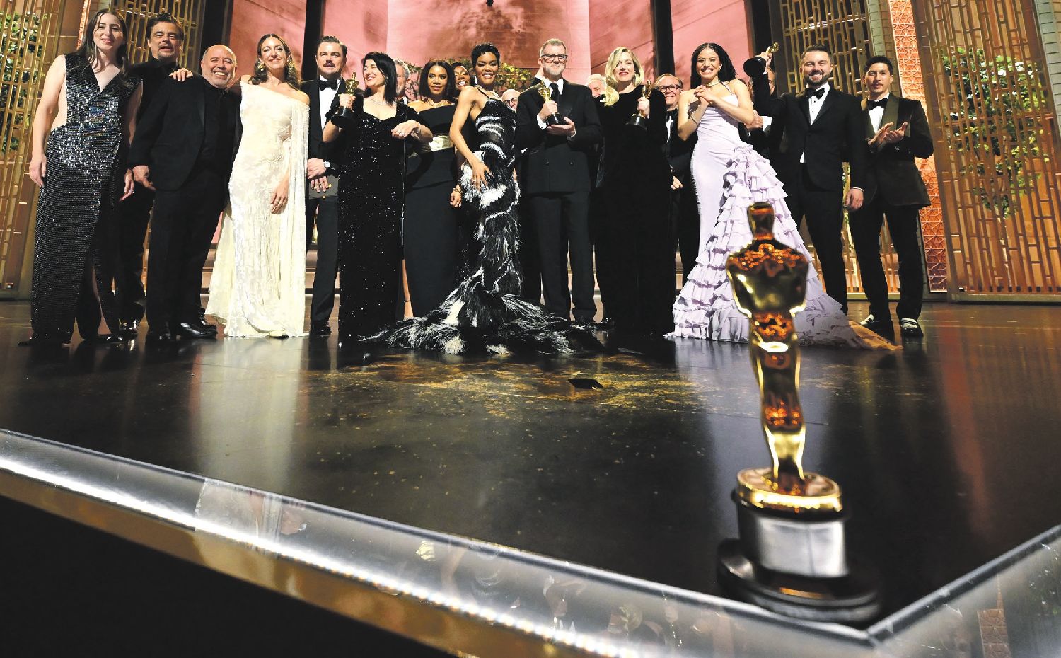 第98届奥斯卡奖颁奖典礼3月15日在美国好莱坞杜比剧院举行,《一战再战》斩获最佳影片奖、最佳导演奖、最佳男配角奖等6个奖项,成为最大赢家。另一大热门《罪人》获得最佳男主角奖、最佳摄影奖、最佳原创剧本奖和最佳原创配乐奖。Netflix推出的两部影片《弗兰肯斯坦》和《K-Pop:猎魔女团》亦斩获颇丰。图为获奖者合影。法新社图