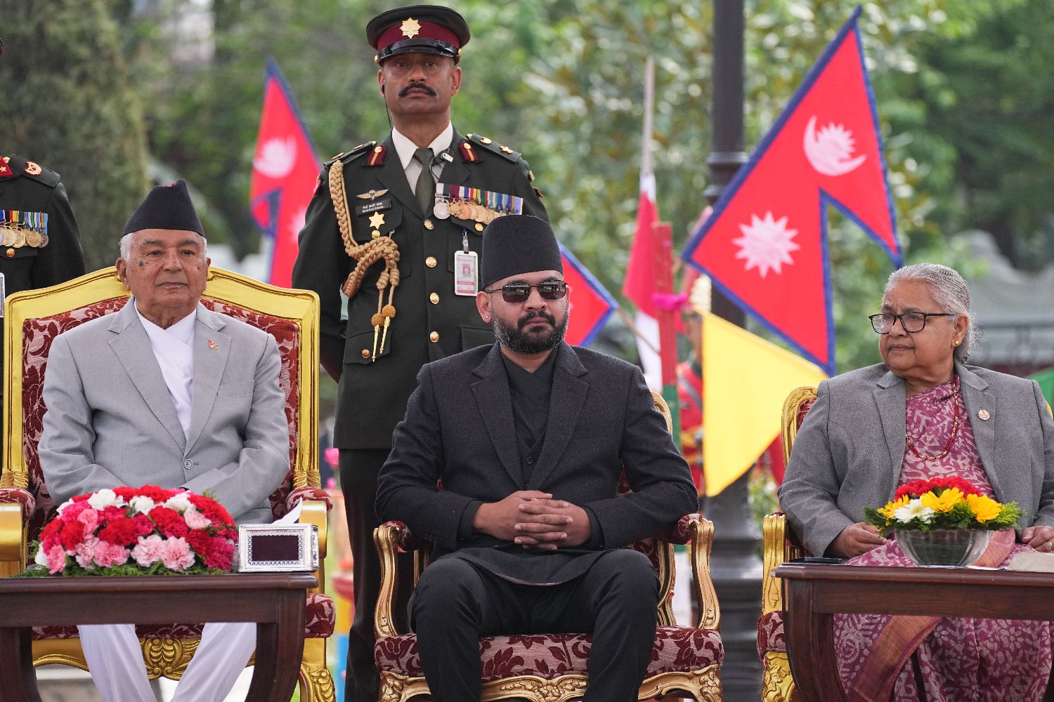 3月27日,尼泊尔总理宣誓就职仪式在加德满都举行。图为尼总统鲍德尔、总理巴伦德拉·沙阿、前总理卡尔基(从左至右)在仪式中。(图片来源:中新社)