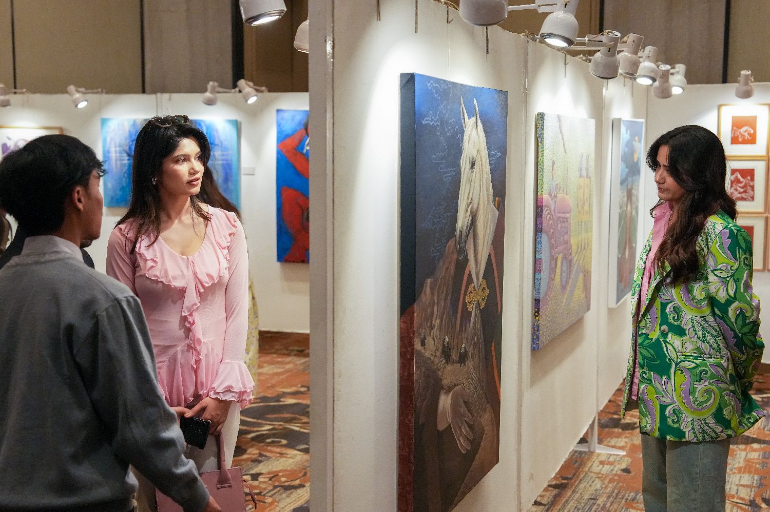 现场展出的画作吸引参观者驻足。
