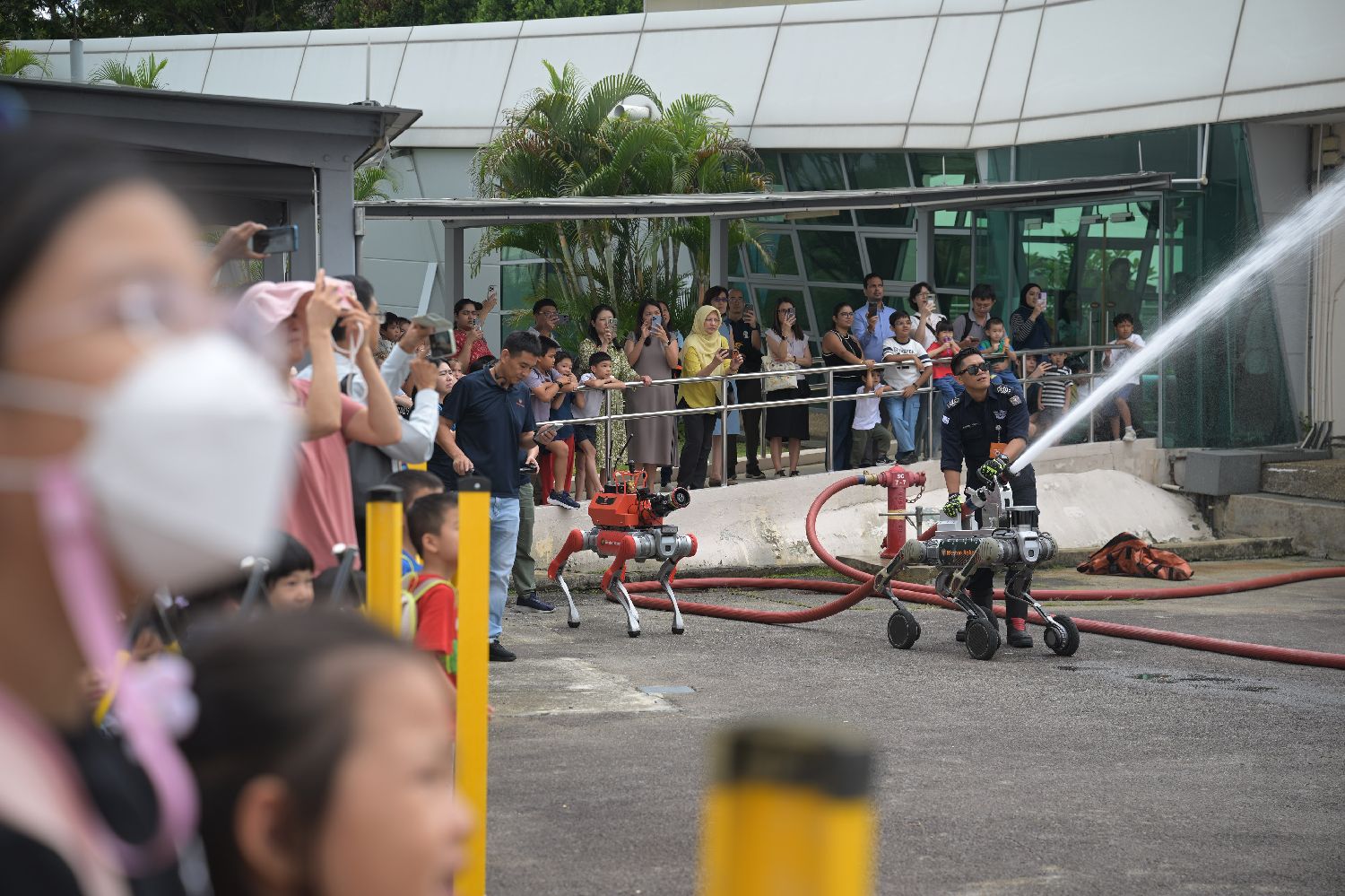 4月9日,一台机器狗在新加坡科学中心举行的“机器人节2026”活动上表演灭火功能。