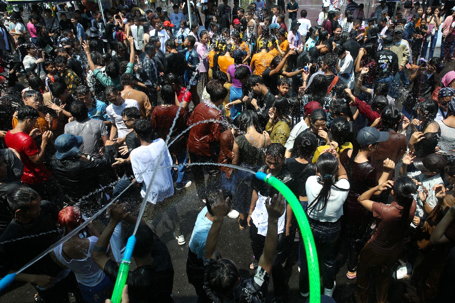 4月13日,人们在缅甸仰光参加泼水节活动庆祝传统新年。
