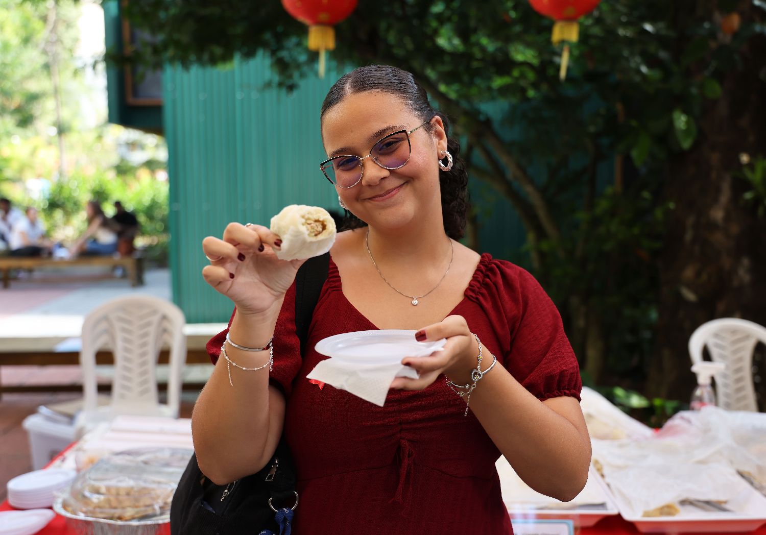 4月15日,在巴西里约热内卢天主教大学举办的“国际中文日”庆祝活动上,巴西学生品尝中国食物。